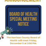 The Harrison County Board of Health will hold a special meeting on December 5 at 2:00pm in the Government Center Coal Room for discussing and considering the employment of a public employee.