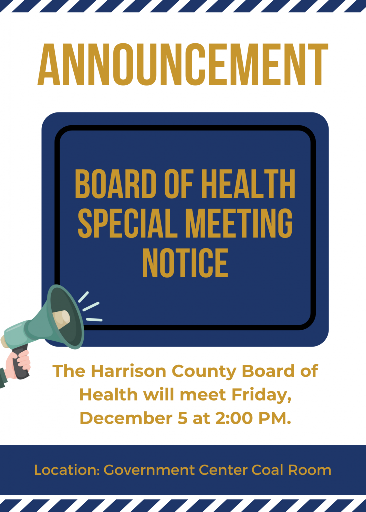 The Harrison County Board of Health will hold a special meeting on December 5 at 2:00pm in the Government Center Coal Room for discussing and considering the employment of a public employee.